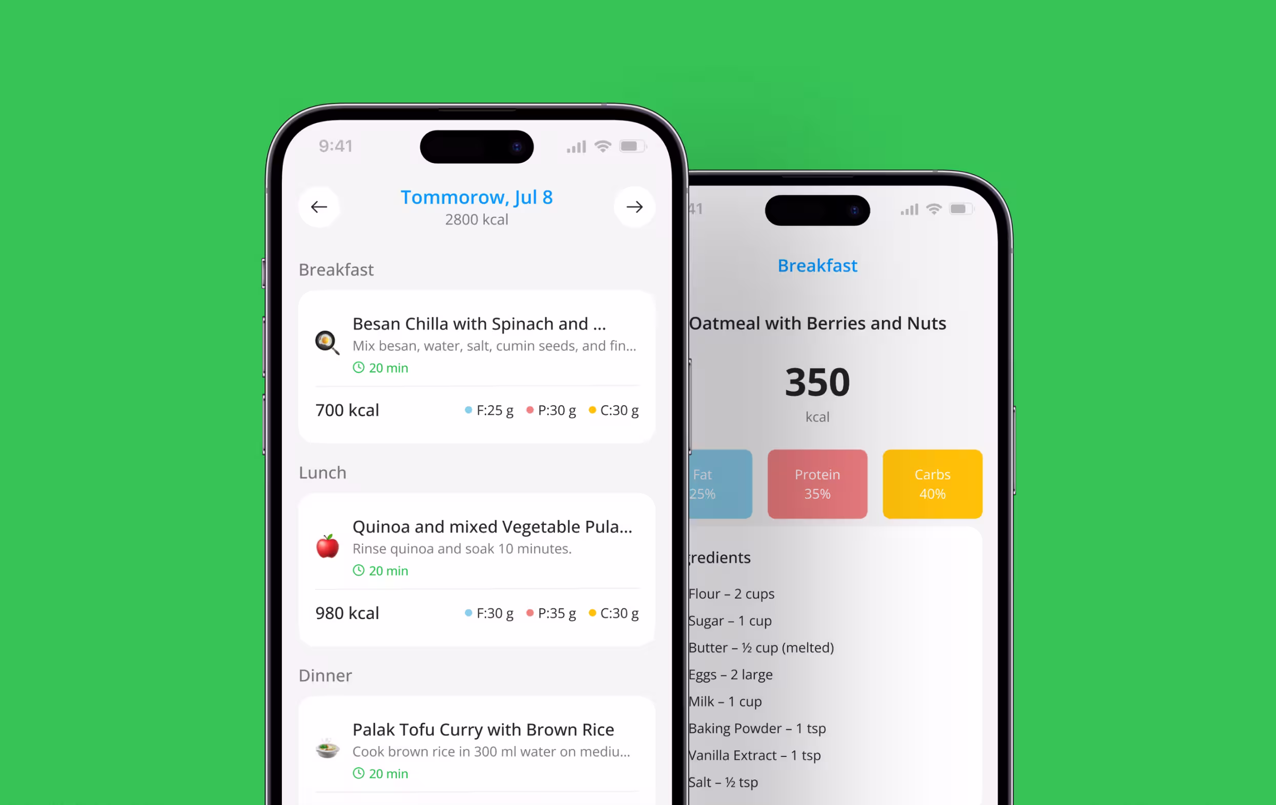 During onboarding, you’ll enter your dietary preferences, dislikes, time limits, and goals — and AI will instantly build your meal plan.